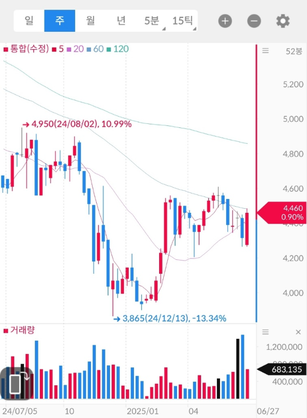 - 아직 60일선과 120일선은 하방 저항 역할 중 → 4,500~4,600원은 강한 매물대