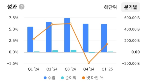 - 2024년 4분기 순손실 발생에도 불구하고, 2025년 1분기부터 다시 흑자 전환된 모습.