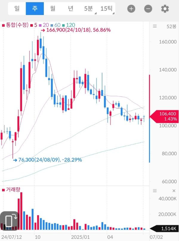 - 주봉 기준 1차 지지선: 100,000원, 저항선: 120,000~125,000원