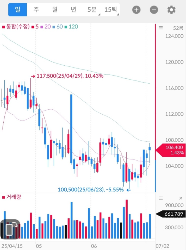 - 2025년 2월 이후 단기 저점 100,400원 → 반등 후 106,000원대 횡보