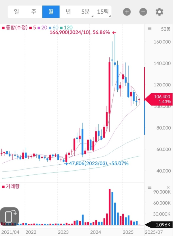 기술적으로는 10만 원대 지지를 유지 중이며, 11만 원 돌파 여부가 단기 추세 복원의 관건입니다.