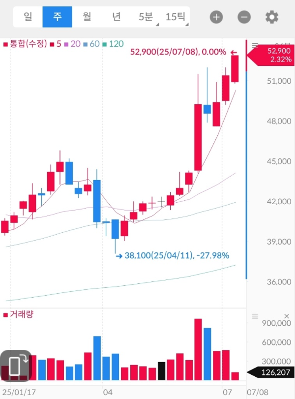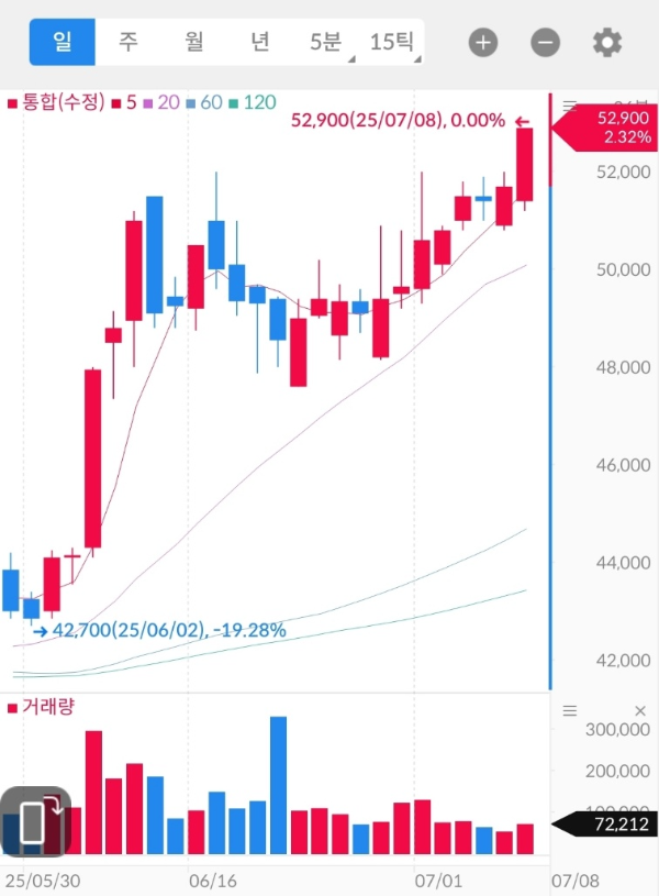 - 2025년 5월 중순~6월 초, 42,000원대에서 급등 시작