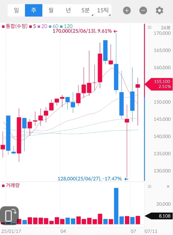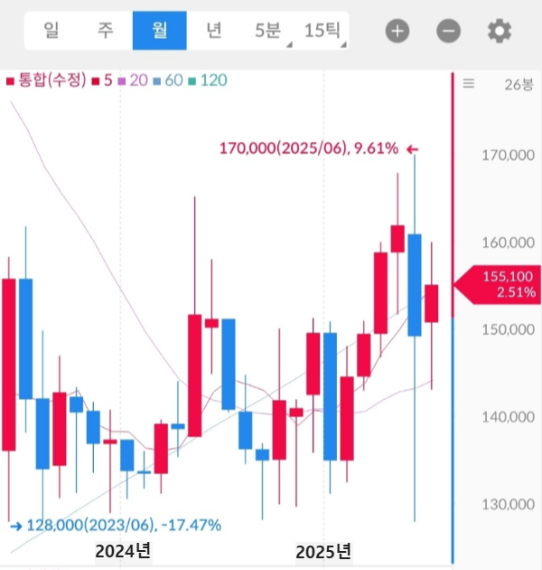 - 2024년 4분기~2025년 1분기: 128,000원 지지 이후 단기 급등 → 170,000원 터치 후 눌림