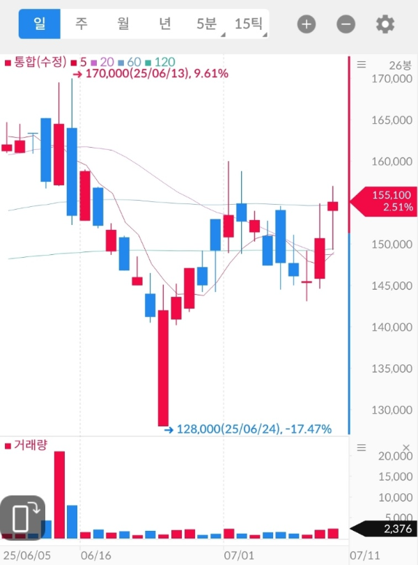 → 150,000원~155,000원대 매물 소화 후 재차 강세 가능