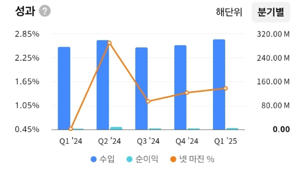 - 분기 매출은 약 280~300M 달러 수준으로 안정적이나, 순이익률은 2% 미만으로 매우 낮은 수준 유지.