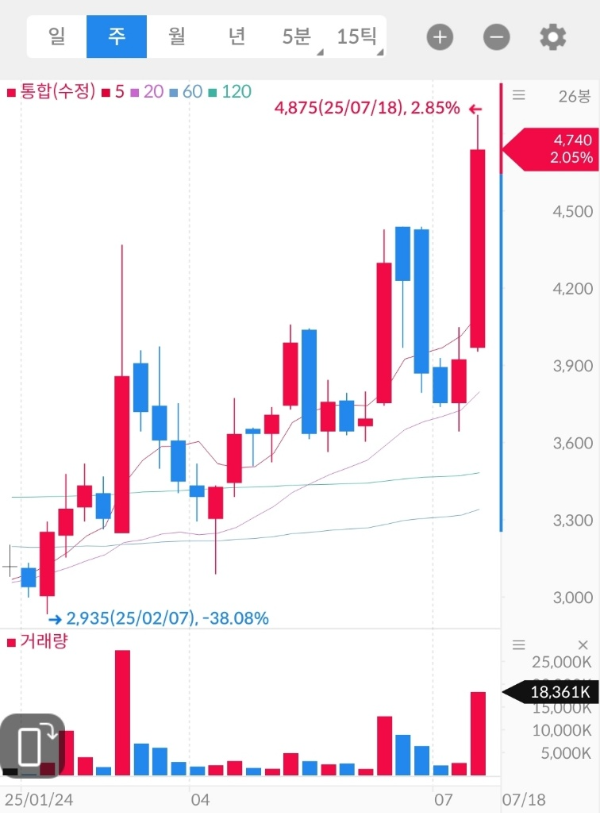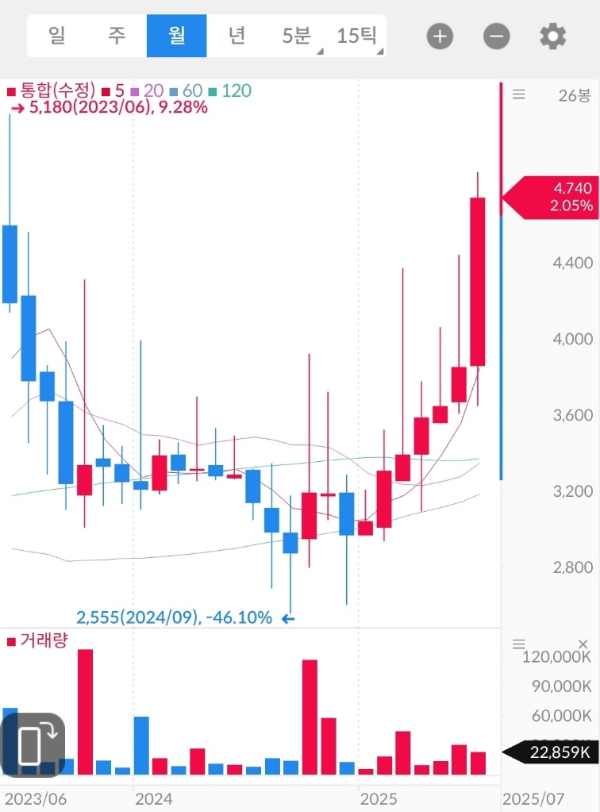 - 2025년 7월, 4,740원 돌파하며 장기 박스권 상단 이탈 + 거래량 동반 상승
