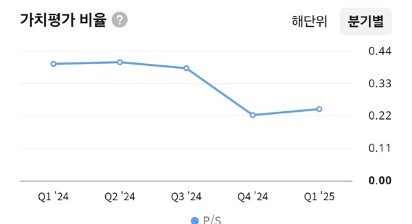 - 2024년 초 0.43배 → Q4 기준 0.21배까지 하락, 밸류에이션 부담은 상당히 완화됨.