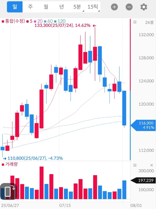- 7월 24일 고점 133,300원 이후 단기 하락 전환