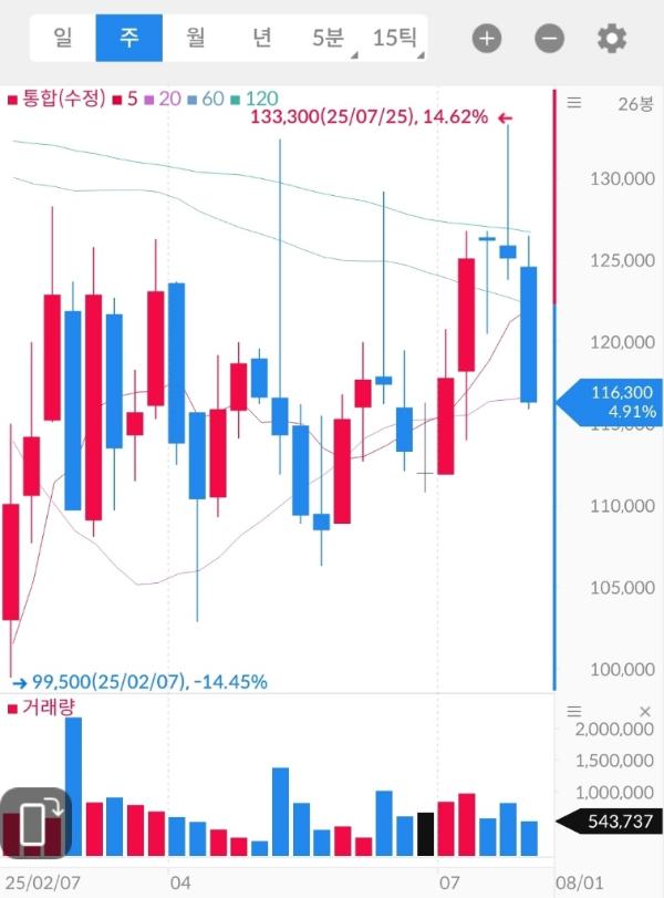 - 7월 중순 133,000원까지 급등 후 30% 매물대 밀집구간에서 저항, 현재는 조정 중