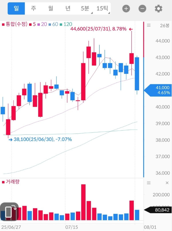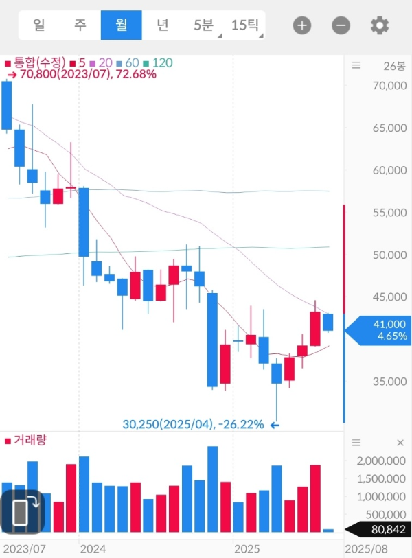 - 2025년 4월 저점(33,050원) → 7월 고점(44,600원)까지 꾸준한 우상향.