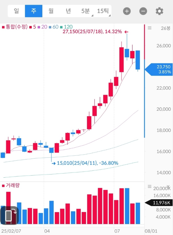 - 2024년 11월 저점(15,750원) → 2025년 7월 고점(27,150원)까지 약 72% 급등