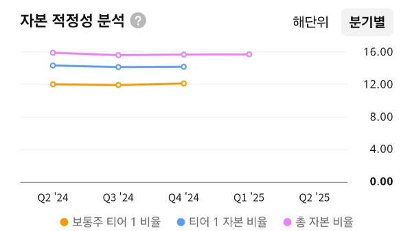 - 총자본비율은 16% 수준으로 안정적이며, 티어1 자본비율도 13% 내외로 우수한 편.