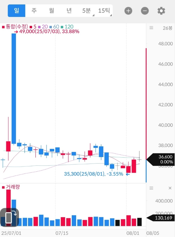 | 단기 목표가 | 39,000 ~ 40,000원 → 60일선 회복 및 박스 상단 돌파 시 추세 반등 기대 |