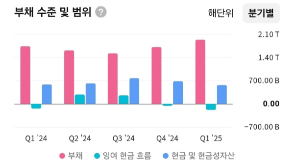 - 부채 수준은 연간 약 2조 원 규모로 일정하며, 현금성 자산 보유량도 안정적.