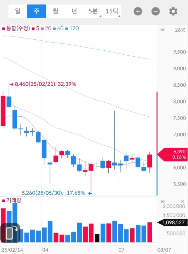 | 중기 흐름 (주봉) | 횡보 구간, 6,000원대 지지 중. 거래량 미확인 |