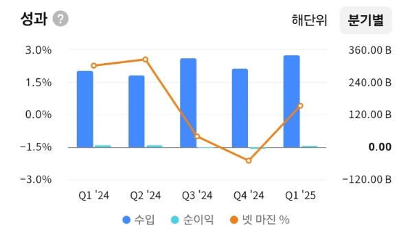 - 2024년 중 순이익이 일부 분기에서 적자 전환, 마진율도 –1~–2%대로 하락하며 수익성 저하.