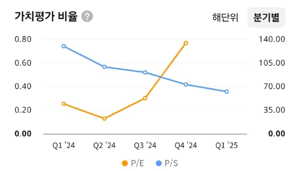 - PSR은 Q1’24 기준 약 0.75배 → Q1’25 기준 0.35배로 하락, 주가 대비 매출의 저평가 구간 진입.