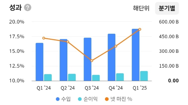 - 순이익률(넷 마진 %)이 15~18% 수준으로 안정적인 고수익 구조를 유지.