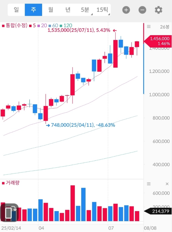 - 2025년 상반기: 기울기 가파른 급등 랠리 → 2025년 7월 사상 최고가 1,535,000원 기록.