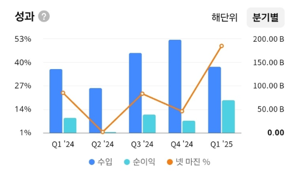 - 분기별 매출 변동에도 불구하고 순이익률(넷 마진 %)이 분기별로 안정적으로 유지되며 2025년 1분기 급등.