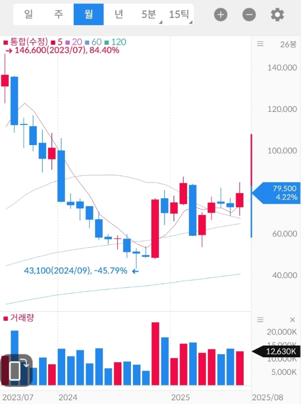 - 장기 추세: 2023년 7월 고점(146,600원) 이후 장기간 하락 추세를 이어오다 2024년 하반기 저점권에서 바닥을 다지는 모습.