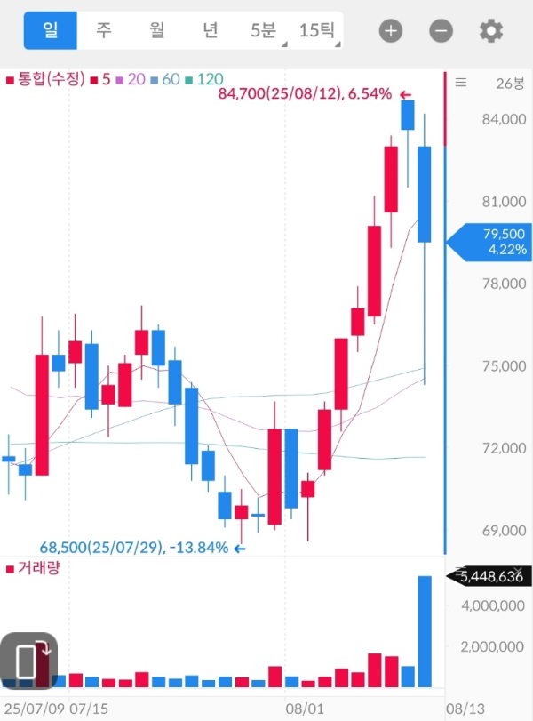 - 최근 흐름: 8월 12일 고점(84,700원) 기록 후 단기 조정, 현재 79,500원에서 지지 시도.