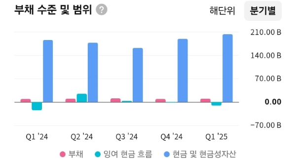 - 부채 비중이 매우 낮고, 현금 및 현금성 자산 규모가 부채 대비 월등히 높아 재무 안정성이 우수함.