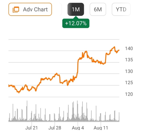 7월 이후 $117 저점에서 반등, $128 부근까지 단기 상승세 이어감.