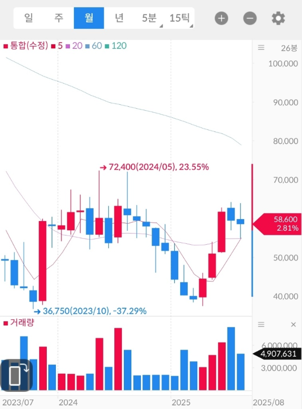 - 월봉상 추세선은 아직 완전한 반전은 아니며, 60,000원대 안착 여부가 장기 상승 전환의 핵심.