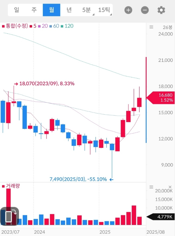👉 월봉상 “하락 추세 마무리 → 상승 전환 초기” 구간. 다만 19,000원대 강한 매물벽 돌파 필요.