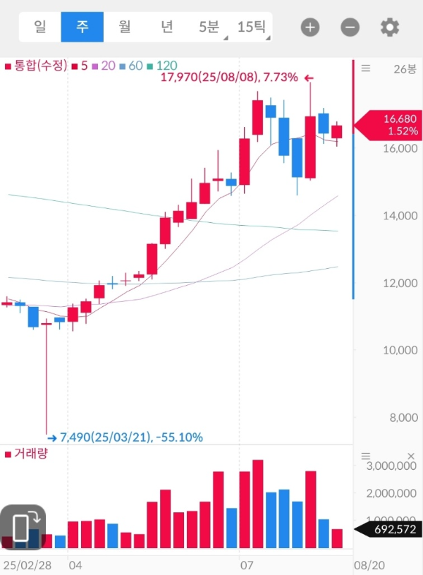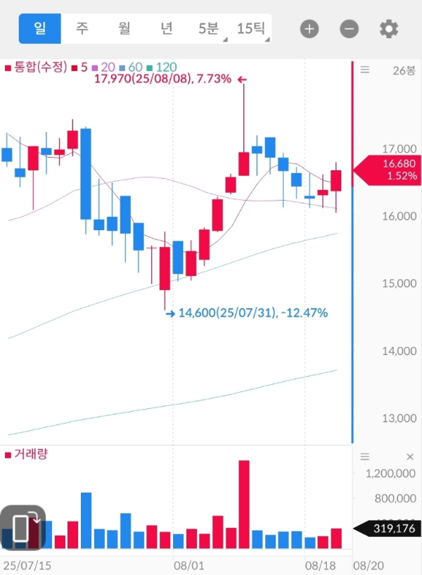단기 고점(17,970원) 확인 후 조정. 5·20주선(16,000원선) 위에서 조정 후 재도약 시도. - 주요 저항선: 18,000원대 초반 (최근 17,970원 고점 확인).