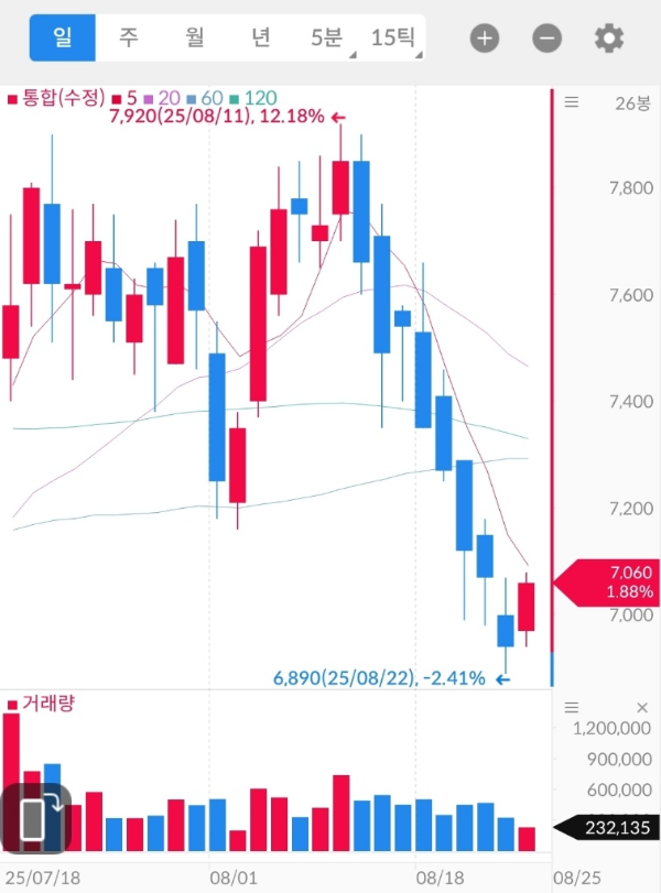 - 8/11 고점 7,920원 형성 후 단기 하락 채널. 지금은 7,000원 인근에서 5·20·60·120·200일선 모두 하회(20일선 7,046, 60일선 7,143, 120일선 7,370, 200일선 7,894).