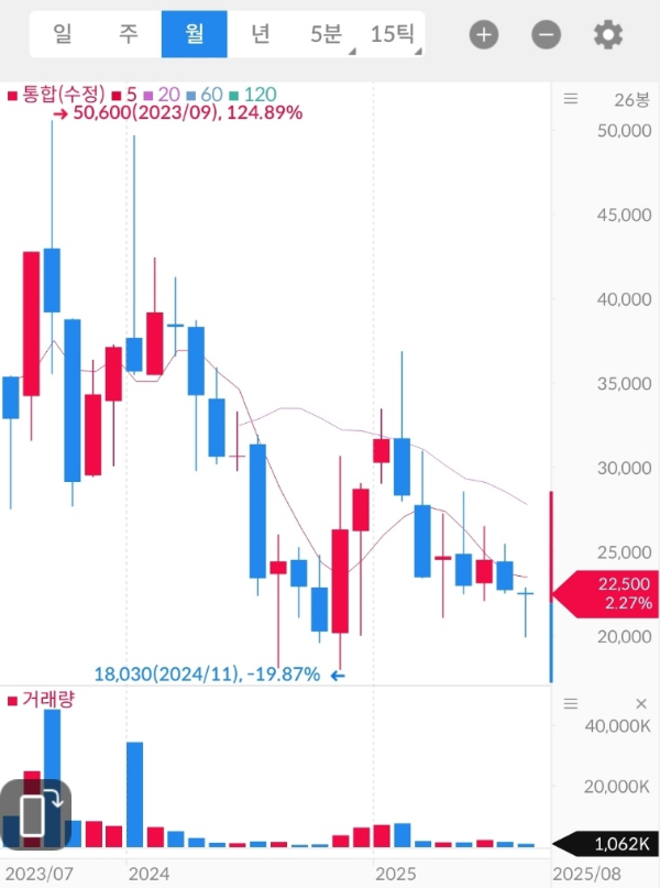 - 2023년 고점(50,900원) 이후 하락 채널 유지.