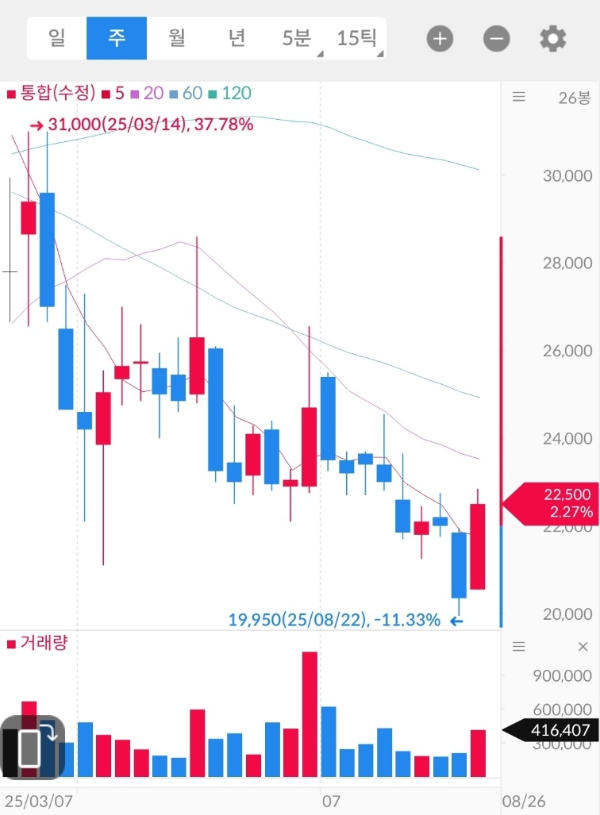 - 추세: 2025년 6월 26일 고점 26,550원 이후 하락세. 8월 22일 19,950원 저점 찍고 단기 반등.