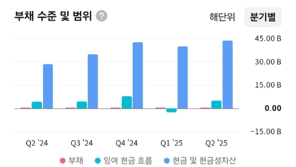 - 최근 분기별 현금 및 현금성 자산은 꾸준히 증가세를 보이며, 부채 대비 방어력이 안정적임.