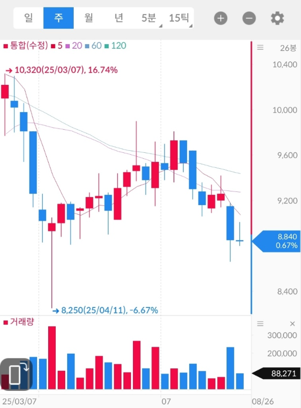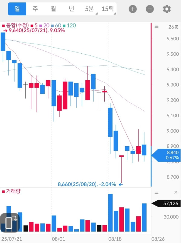 - 추세: 8,600원대에서 단기 반등(25.08.20) 이후 8,800원대 소폭 상승. 이동평균선(5·20일선)이 수렴 중.
