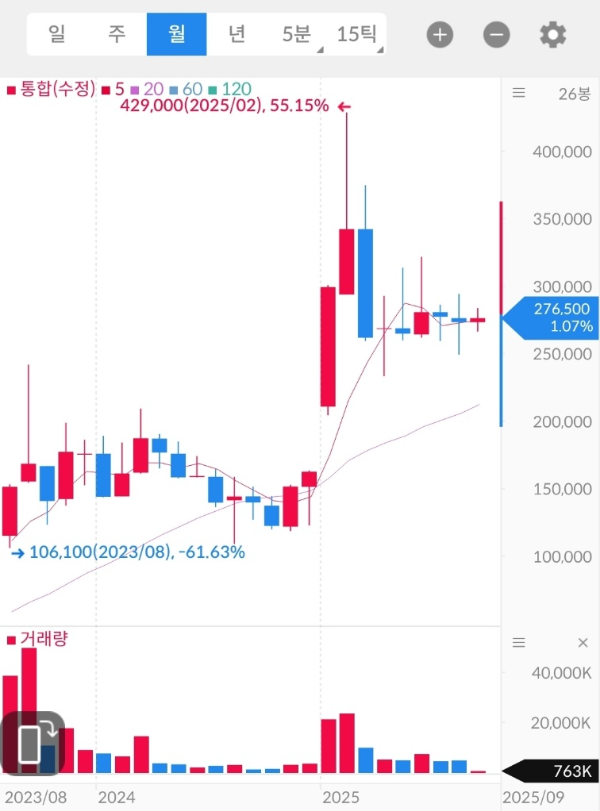 - 월봉: 2025년 2월 고점(429,000원) 이후 조정, 현재 27만 원대 횡보. → 고점 대비 -35% 수준.