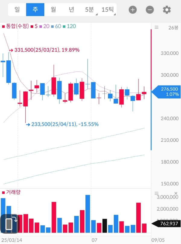 - 단기 추세: 2025년 2월 고점(42만 9천 원) 이후 하락, 8월 24만 9천 원 반등.