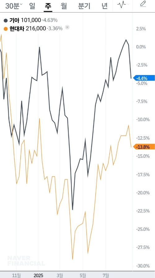 - 현대차 : -13.8% (2025년 들어 변동성 확대)