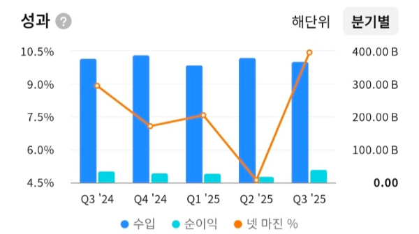 - 분기 매출은 큰 변동 없이 안정적인 박스권 흐름을 유지하고 있다.