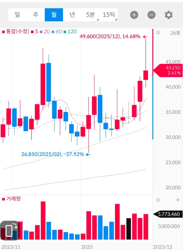| 중기 목표가 | 50,000~55,000원 (월봉 매물대) |