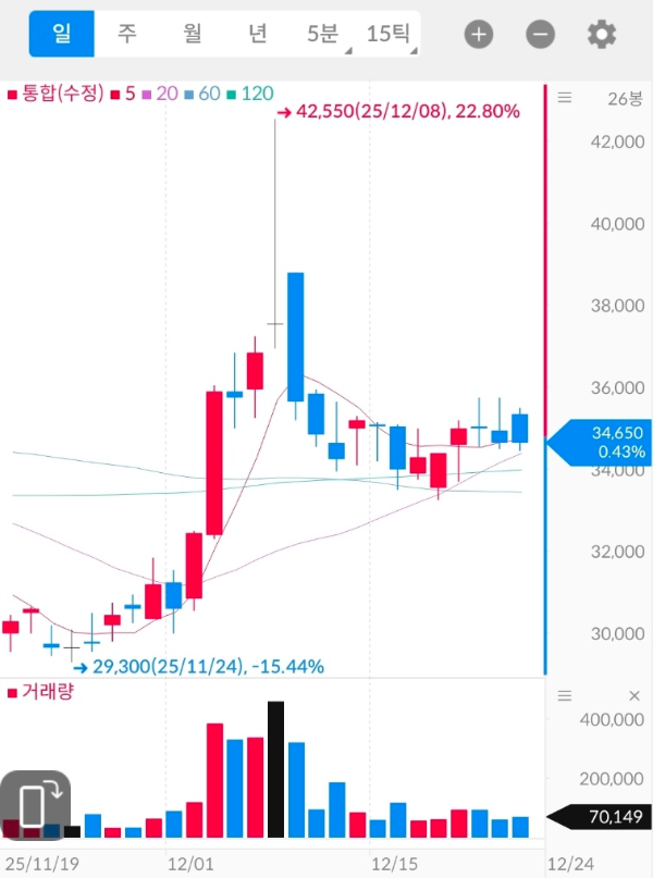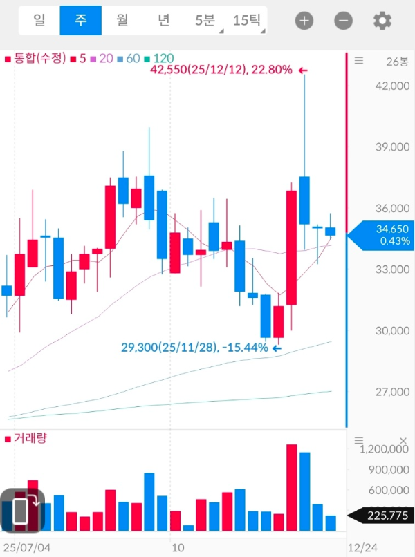 | 1차 관심 매수 구간 | 34,000~35,000원 (일봉·주봉 지지) |